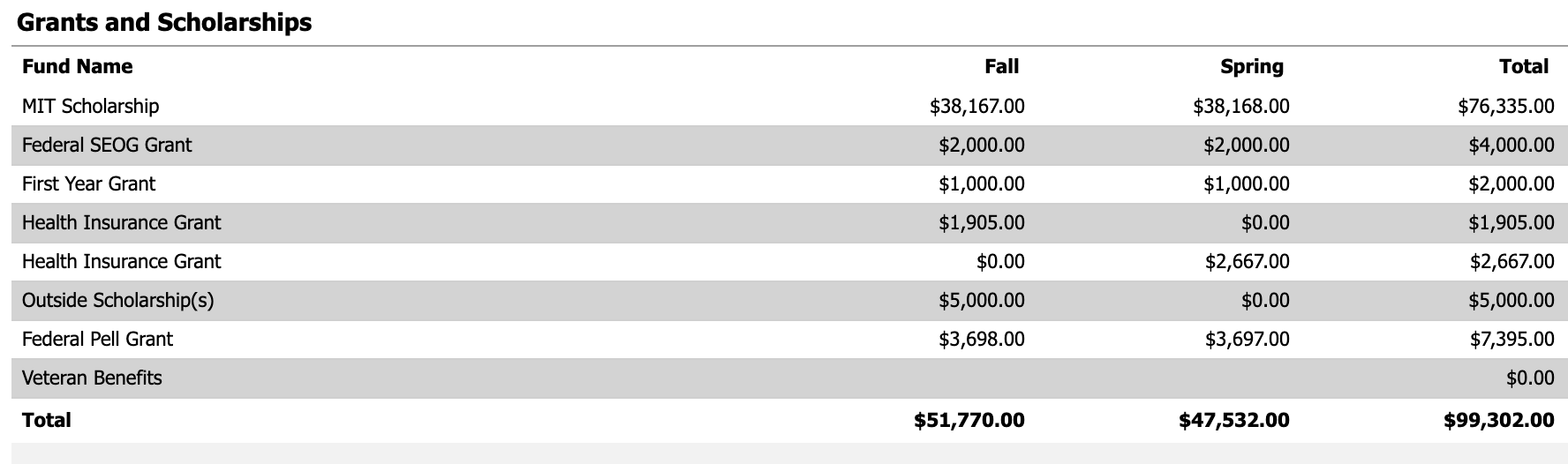At first, it may look a bit confusing—but it's overall pretty simple. The first image—"Grants and Scholarships"—shows the specific funds that are funding my education. For the 2025-2026 award year, I receive an institutional (MIT) scholarship in the amount of $76,335, a Federal SEOG (Supplemental Educational Opportunity Grant) in the amount of $4,000, MIT's First Year Grant of $2,000, a Health Insurance Grant of $4,572, the Federal Pell Grant of $7,395, and a local outside scholarship of $5,000. This all comes out to a total of $99,302.