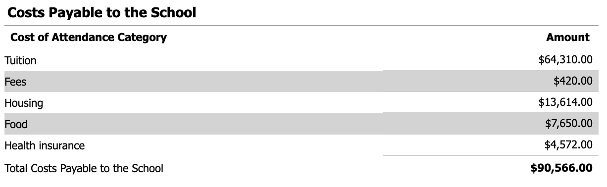 The second image—"Costs Payable to the School"—just showcases how much money is going to be paid to the school, and for what purpose; in my case, all of this is paid from my scholarships/grants. For the purposes of calculating our tax liability, scholarships and grants are effectively treated as equivalent to one another. You can see that $64,310 is going toward tuition, $420 toward required fees, $13,614 toward housing, $7,650 toward food, and $4,572 toward health insurance. This yields a total of $90,566 payable to MIT.