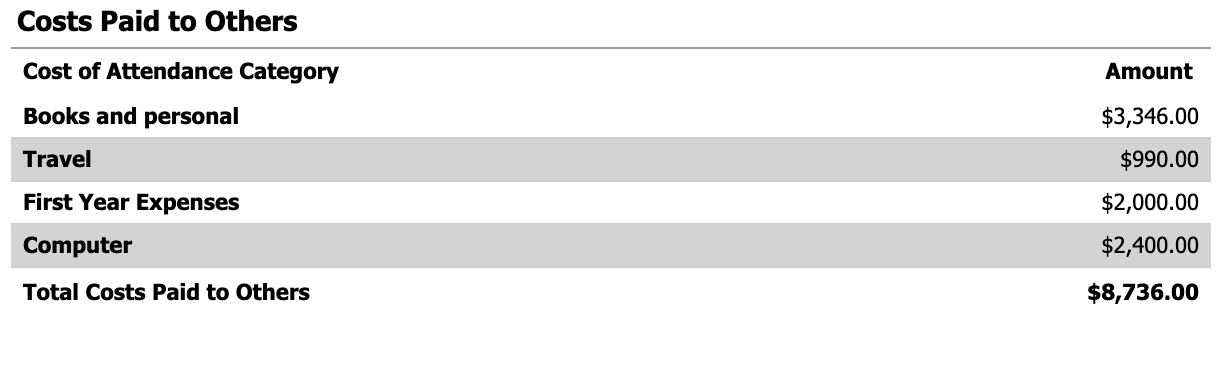The third image—"Costs Payable to Others"—refers to the part of your Cost of Attendance that isn't necessarily paid directly to the school, but still are seen as necessary/recommended expenses for you to be able to attend college. Usually, these funds will be paid by you personally to other people—and if you have scholarships which cover these amounts (as I do), you will receive a refund from your school directly into your bank account. It lists $3,346 for "Books and personal", $990 for travel, $2,000 for first-year expenses, and $2,400 for a computer, totaling $8,736 in costs paid to others.