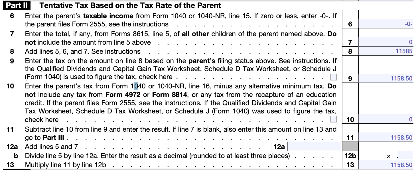 Looking at Part II, I put 0 in box 6 as my custodial parent's taxable income was 0 on their most recent 1040. I don't have any other sibling which files 8615, so I also put 0 in box 7. I added 5, 6, and 7 and put that into 8, yielding $11,585. I then looked at my parent's filing status (Head of Household) and cross-referenced that with the tax brackets. You essentially act as if box 8 was added to your parents income—thus, I added 11585 to 0, which all fell within the 10% marginal tax rate, thus I entered 10% of $11,585 into box 9 ($1158.50).