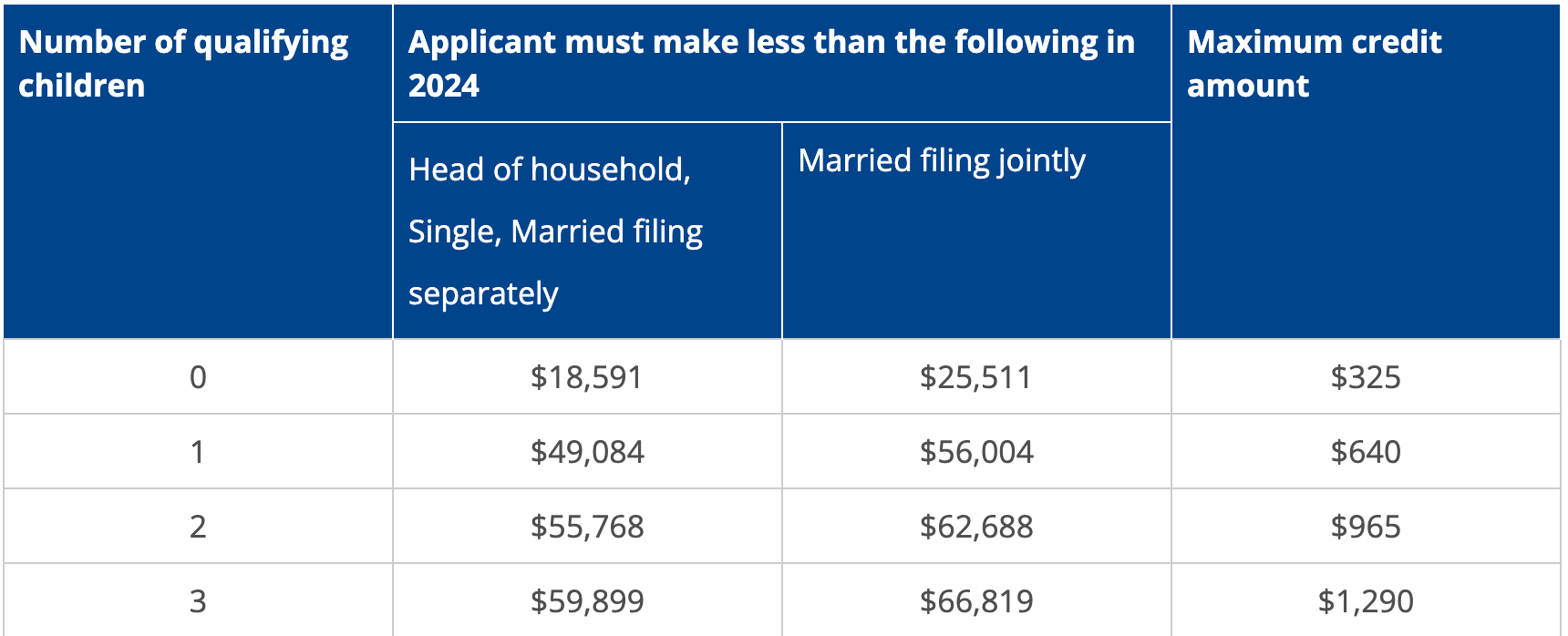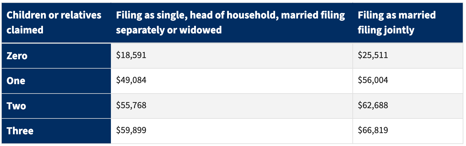 This is not something directly applicable to your educational tax burden, but it is key to consider for students from low-income families before they attempt to become independent for tax purposes, as it could lead to the loss of a large amount of tangible funds for your family. Below is the income qualification bracket for the EITC—if your family doesn't fit solidly within those barriers, then considering the EITC may be a null point when considering independence for tax purposes.